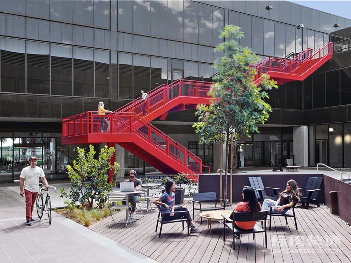 把地下室帶到主臺,辦公室圍繞著一個連接內部辦公室和室外空間的中央庭院組織,而一個標志性的Vans紅色樓梯成為內部不同群體之間連接的文字和象征性符號。因此,它連接一樓的咖啡廳,二樓的咖啡區和三樓的戶外露臺燒烤。工作場所的設計支持一系列積極的工作風格,培養協作和創新的文化。